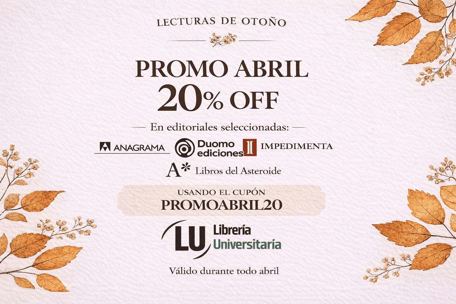 Durante abril, disfrutá un 20% OFF en editoriales seleccionadas: Anagrama, Duomo, Impedimenta y Libros del Asteroide.